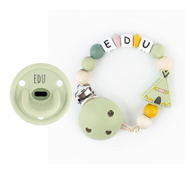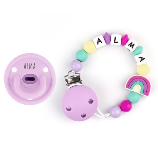 - Chupete de silicona 100% en una gran variedad de colores, personalizado con el nombre del bebé. Tetina fisiológica de talla única para el correcto desarrollo bucodental del bebé. Es talla única